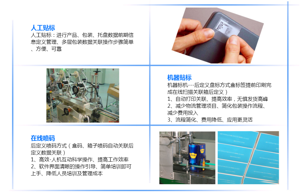第一步--------------------------------------建立防竄貨管理係統、采用條碼、二維碼標簽對產品的數據管理。 第二步--------------------------------------每件產品賦予身份號碼、建立一對一的數據關聯、分區域進行數據管理。 第三步--------------------------------------通過對每件產品、包裝箱以及托盤貼標、進行相關聯套碼管理。 第四步--------------------------------------進行人工或者機器貼標、在線噴碼根據數據定義分銷產品。 第五步--------------------------------------產品出庫入庫自動化數據采集、確保企業及時掌握產品流動方向全程數據監控、對產品進行追蹤溯源。 第六步--------------------------------------香蕉视频好色先生提供經銷商查詢、稽查查詢、消費者查詢,快速獲取產品分銷區域及竄貨信息。 |